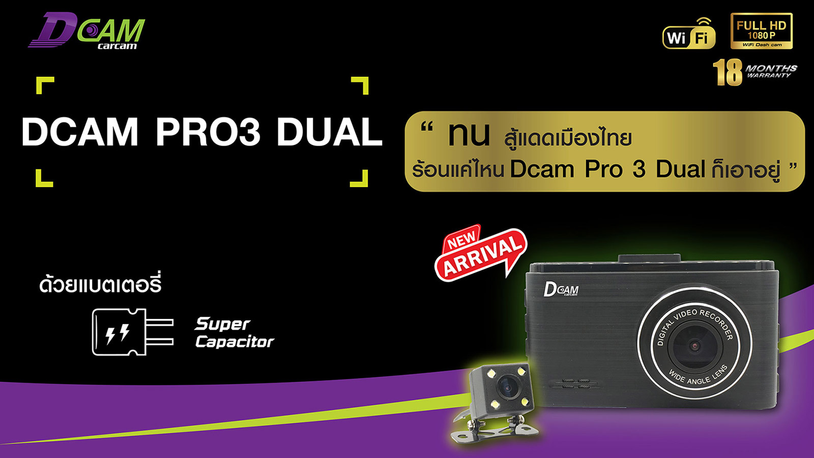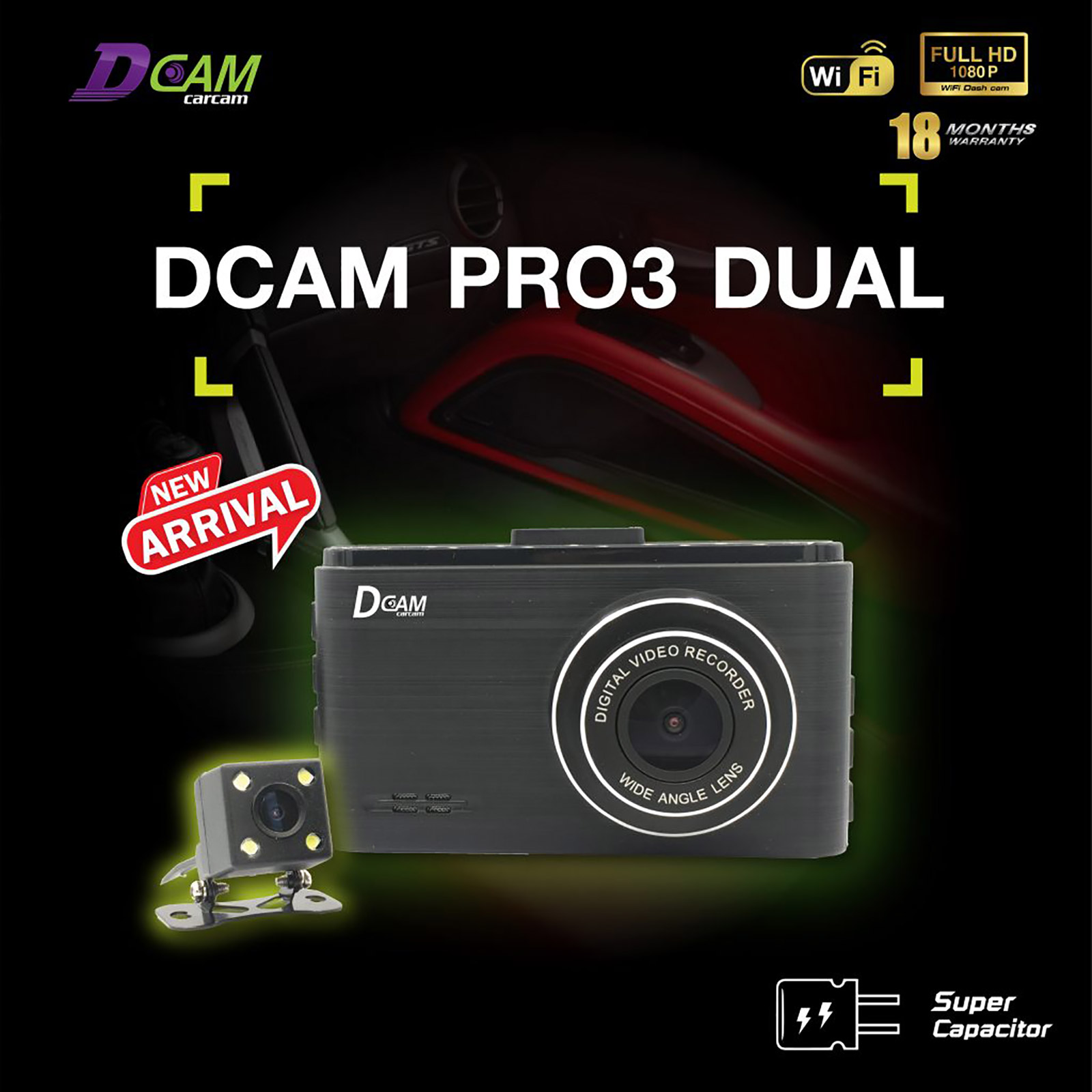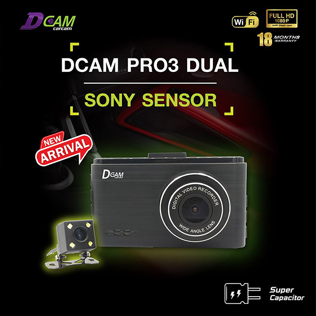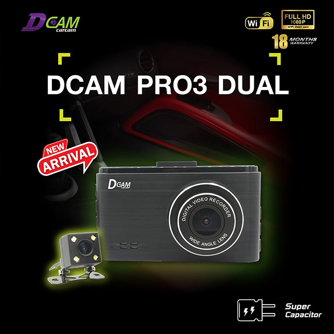 กล้องติดรถยนต์ หน้า-หลัง Dcam Pro3 Dual Supercapacitor รับประกัน 18 เดือน แถม Micro SD card 16 GB พร้อม Wi-Fi ในตัว รองรับการเชื่อมต่อกับสมาร์ทโฟน และแบตเตอรี่แบบ Super Capacitor ใช้งานได้นานขึ้นโดยไม่ต้องเปลี่ยนแบตเตอรี่ ส่วนหน้าจอแสดงผลอยู่ที่ 3 นิ้ว แบบ IPS แสดงภาพได้คมชัดสมจริง นอกจากนี้ ยังรองรับเมนูภาษาไทย, ฟีเจอร์ล็อกไฟล์ ทำให้ไฟล์วิดีโอสำคัญไม่ถูกบันทึกแบบวนทับ และรองรับ microSD Card สูงสุด 128 GB (Class 10) กล้องหน้า มุมมองกว้าง 150 องศา บันทึกที่ความละเอียดสูงสุด Full HD (1080p) กล้องหลัง มุมมองกว้าง 120 องศา บันทึกที่ความละเอียดสูงสุด HD (720p)